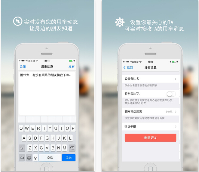 3、特别关注:用户可以选择自己特别关心的好友。该用户的所有用车动态都会时时推送给你。