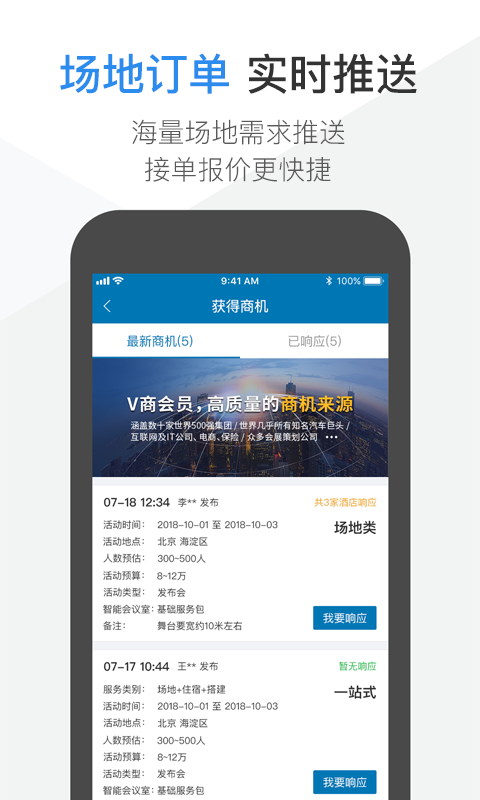 【帮助获取更多生意】可以实时获取近万家塔米V商用户(会展、策划、公司及集团客户)发布的对智能会议场地以及餐饮住宿的需求,帮助酒店进一步扩大生意来源。