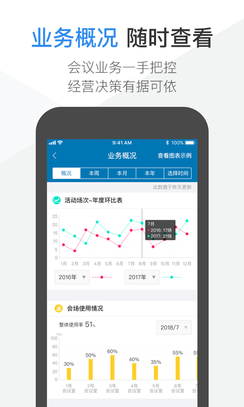 2.首页新增会场使用率数据统计,酒店会议室使用情况一目了然;增加新商机、新增活动消息滚动功能,及时告知酒店新业务进展。