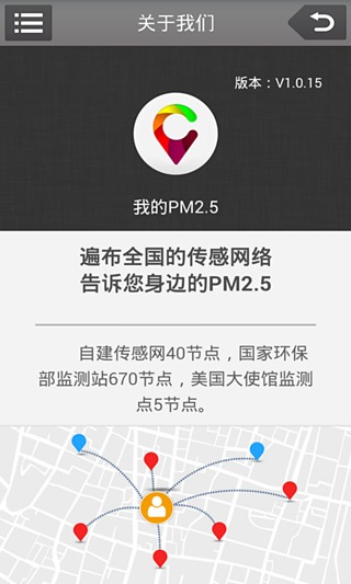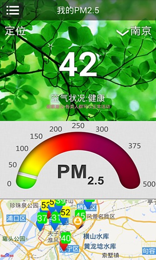我的PM2.5是一款手机实时检测空气质量的应用,调用国家局官方实时权威数据,让你随时知道我所在位置的PM2.5。独家自建的传感器,实时监测 交叉定位,每15秒更新一次数据,确保数据的准确和及时。告诉您所在地的空气质量,让您知霾,避霾,做自己的空气监测专家。