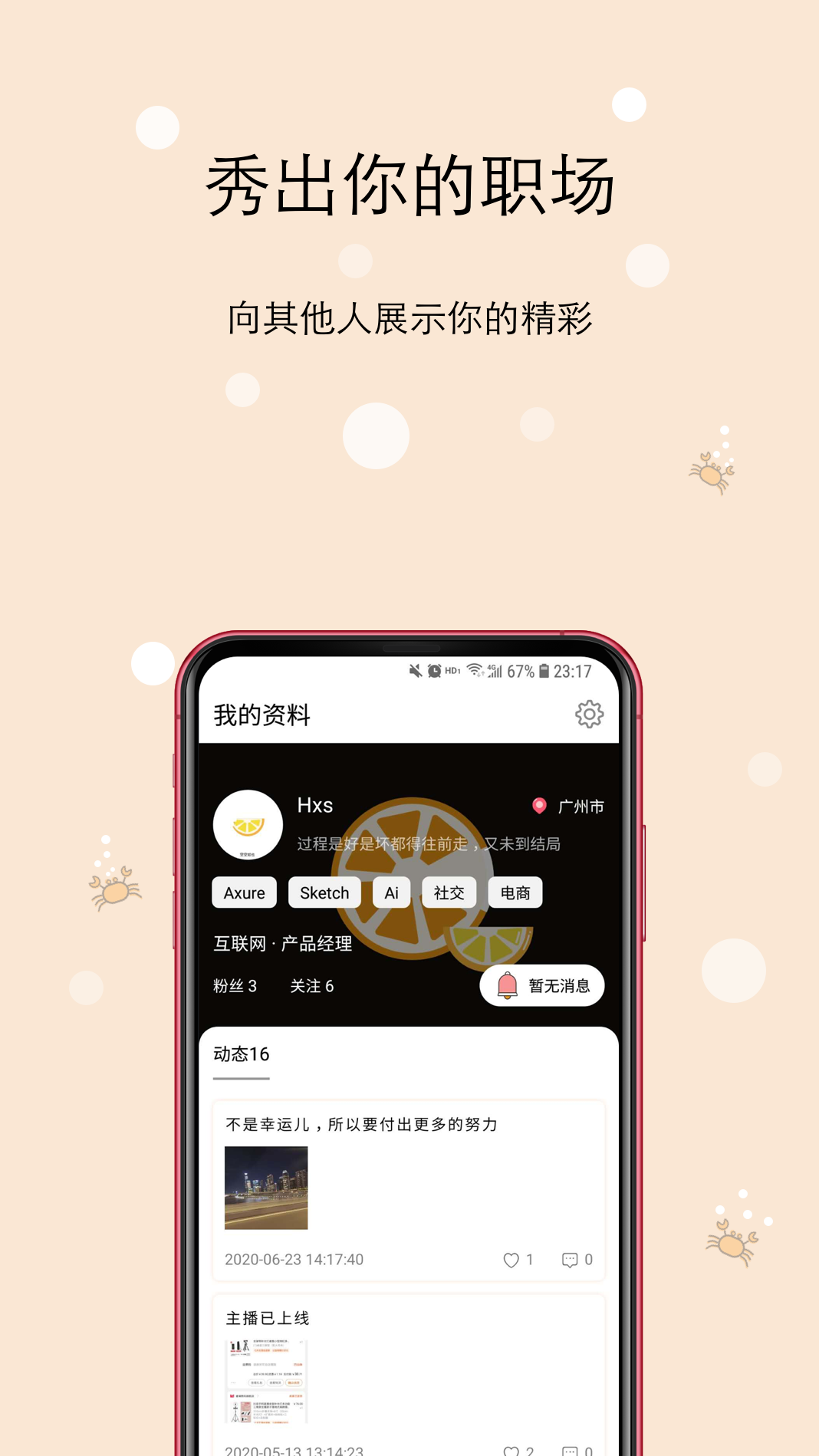 一款清新的轻职场APP,你可以在这里找到你的职场圈子,你的同行都在这里,你可以在这里发布动态,向你的同行请教或者将你的经验教给别人,交流学习,秀出你的职场。