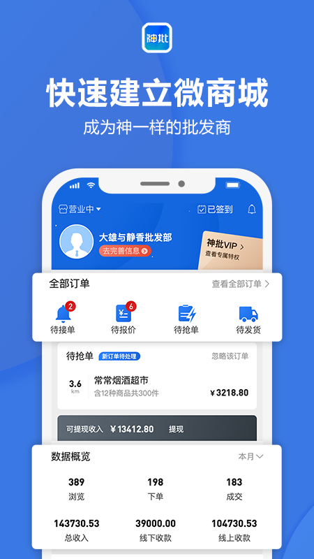 神批—全国领先的批发商网上开店助手,让你成为神一样的批发商。只要你有货源,就可以注册神批,一键生成专属微店铺!增加获客渠道。把被电商抢走的订单夺回来。高效维系老客户!