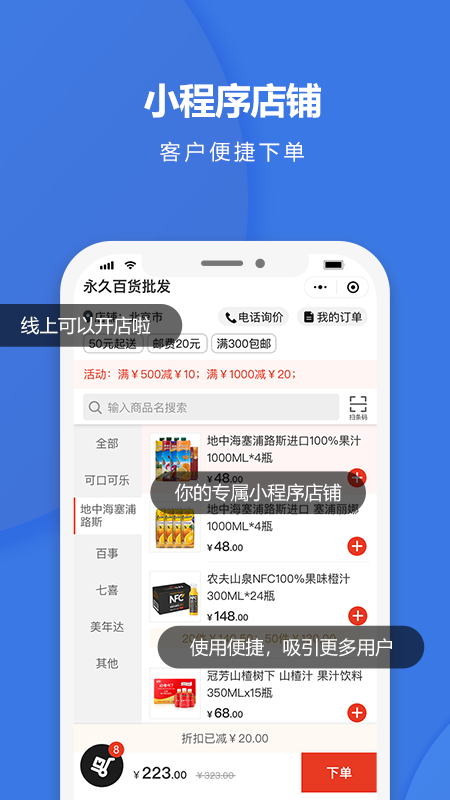 1、优化订单提醒通知,再也不怕错过订单消息2、首页上线使用教程和便利店拓客技巧,让您5分钟完成开店!3、调整”创建商品“在搜索添加页位置,点击就可以添加,省时不费力