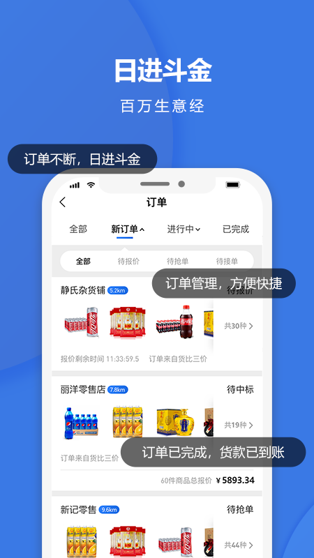 全市客户发布订单,供应商在线抢单。订单能送就能抢,生意越做越大。