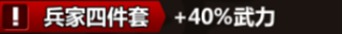 兵家四件套:装备四件兵家装备可获得来自装备的武力属性加成+40%。
