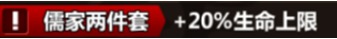 儒家两件套:装备两件儒家装备可获得来自装备的生命属性加成+20%。