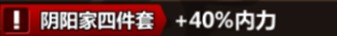 阴阳家四件套:装备四件阴阳家装备可获得来自装备的内力属性加成+40%。