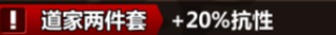 道家两件套:装备两件道家装备可获得来自装备的抗性属性加成+20%。