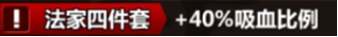 法家四件套:装备四件法家装备可获得来自装备的吸血比例加成+40%。