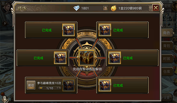 修炼介绍:点击进入修炼界面后,可以看见分布于四周的6个修炼小宝箱以及位于中间处的1个修炼大宝箱,大宝箱奖励在完成所有小宝箱的修炼任务后解锁。解锁小宝箱需要完成一定次数的修炼任务(例如:49级完成3次修炼任务可以解锁)。