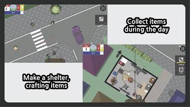 游戏开局会有点头晕,是而且比较平滑,开局只有小刀,人物前方的U型是武器的攻击范围,屏幕正中央的下方有个背包,里面可以制造东西,而且捡的东西都在里面。需要按住选项向左滑即可,吃东西也是上述操作。屏幕右边有这移动方向,左边移动人物。左上角依次是天数,时间,血量,饥饿度。开局只需要乱走,捡东西,在天黑之前找到一个小房子进去躲在角落,调整好角度,一直打就可以,近战武器有休息时间,打一下需要停顿一小会。蹲在角落躲过黑暗的原因是天黑只有不到3mm左右的视野其余全黑,而且蹲在角落前提是需要做出一件木甲,或者有把距离较远的武器。我因为开局不知道建造在哪,于是躲在角落靠着小刀和一堆绷带活过了夜晚,屏幕右上角点开有四个选项,最后一个是存档,前面的忘了。躲在墙角可以造一个工作台挡着然后做一个棒球棒,和弓,因为只需要木头和布。弓射出去的箭是可以捡回来的。