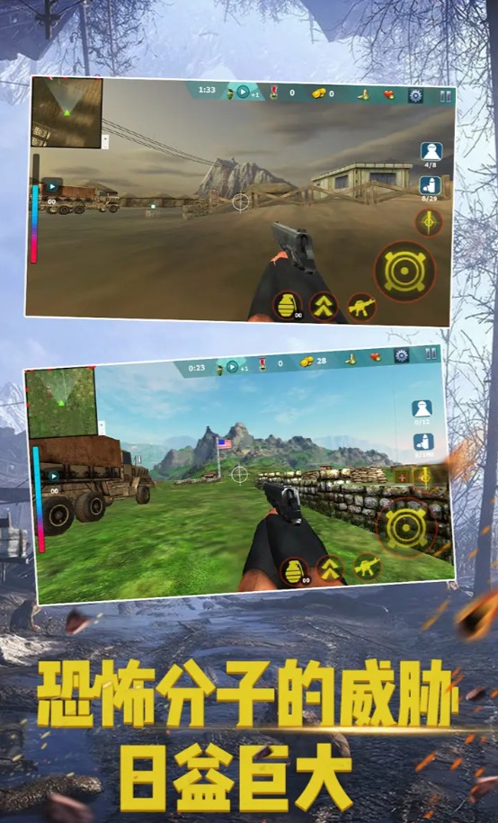 《火线使命:前线突击》是一款以打击恐怖分子为背景的游戏。恐怖分子的威胁日益巨大,为了家园的安全,主角不能再坐视不理,潜入他们的基地,捣毁他们的阴谋,完成任务获得奖励。升级你的各种武器和装备,获得更强大的能力,有效地打击罪犯,让家人和朋友不再害怕。