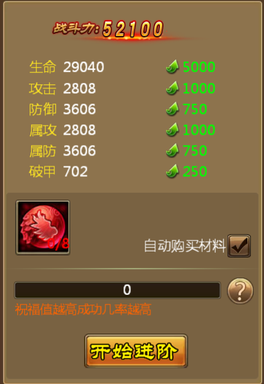 进阶用到的材料主要为:羽翼进阶丹,主要通过游戏内活动以及副本产出,如果玩家遇到羽翼进阶活动,还会额外返还大量进阶材料,是进阶的黄金时间。同时,游戏内有提供了自动进阶功能,一键进阶,省时省力。