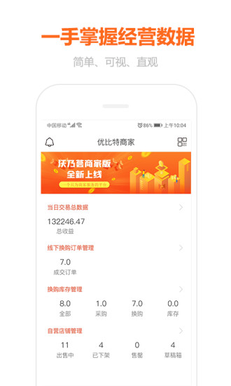 沃乃荟商家版APP,轻松掌控经营数据,界面可视且直观;其强大的功能模块,涵盖商家所需的一切;商家信息即时推送,便于随时接收订单动态;轻松管理商品上下架,为广大的用户提供便利的消费体验;一码多能,二维码功能涵盖收款与兑换。