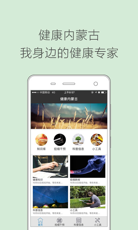 健康内蒙古app由内蒙古自治区卫生和计划生育委员会倾心打造,软件涵盖了预约挂号、知识库、控烟干预等多重功能,旨在为用户提供更加轻松便捷的健康生活体验。