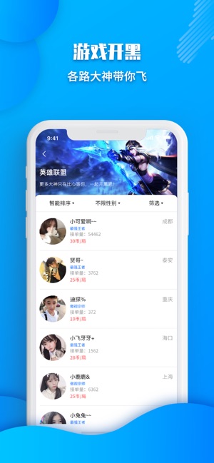 专为游戏爱好者打造的在线互动陪玩平台,覆盖多款热门游戏,英雄联盟、王者荣耀、、绝地求生,各路大神陪你驰骋战场,