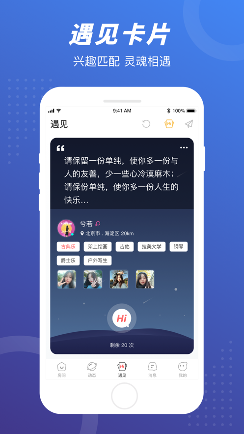 语玩app,场景式交友平台。智能匹配,一键开启室,支持唱歌、聊天、看电影等多种玩法,通过聊天发现更多有趣灵魂,支持同城匹配,感兴趣的朋友点击下载吧。