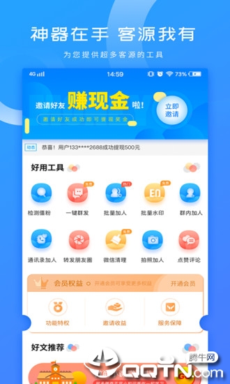 加人app,手握神器,客户源源不断,为您呈现众多强大的工具;微商小课堂,带来丰富的微商实用知识;检测僵粉,帮助您识别被删除或拉黑的好友;批量水印,一键生成多张专属水印;一键群发,实现智能化消息/图片/小程序/文章公众号的快速发送。
