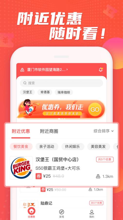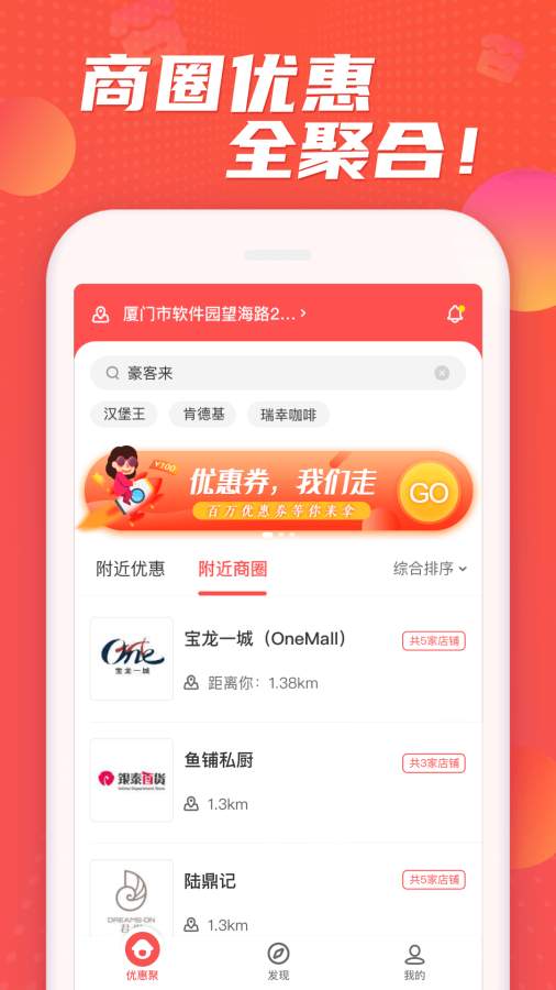 用户可以通过优惠聚APP的强大本地化品牌检索功能快速获取属于自己附近的品牌商家优惠信息。
