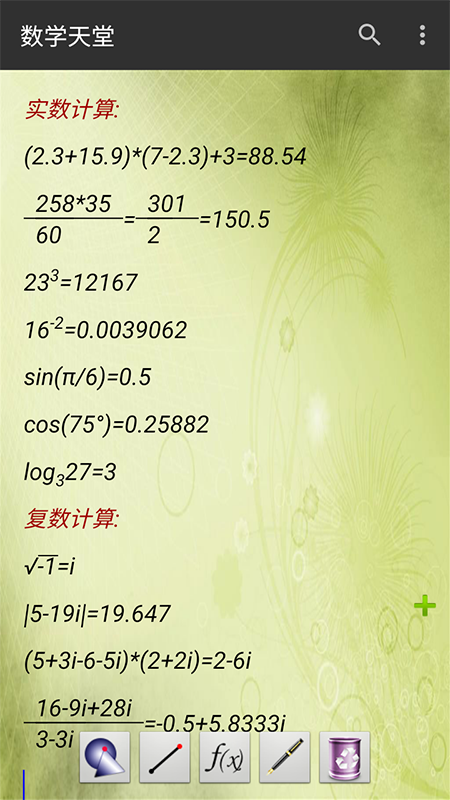 数学天堂app完全改变了以往计算器单一数值计算的工作模式,通过构建数学解析核心完美解决了数学计算的格式化输入、计算、绘图三大问题,并把三者有机的结合在一起,实现了数学领域的交互式解析计算,为数学领域打开了一个更加广阔的应用空间。