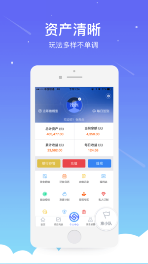 5.个人中心贴心工具箱,可查看资金明细、投资记录、福利站、以及计算收益;
