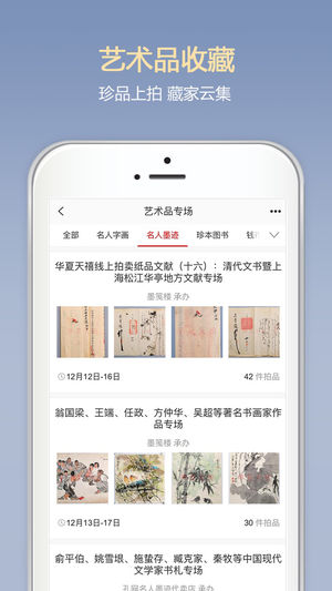 - :名人墨迹、名人字画、连环画、红色文献、古旧地图、碑帖印谱、版画宣传画、老照片、邮票、钱币、陶瓷、玉器、文房雅玩、古玩杂项