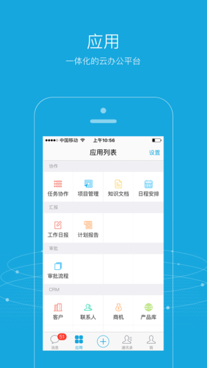 9、对接第三方应用:对接微信企业号、服务号,云OA还可以通过OpenApi对接企业的呼叫中心系统、ERP系统等第三方应用;