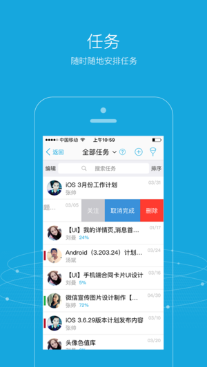 4、项目协作:项目和任务作为云OA中不可少的应用,项目任务分解,相关事项关联系统化的推进,任务管理更好的将执行过程及时有效反馈沟通;