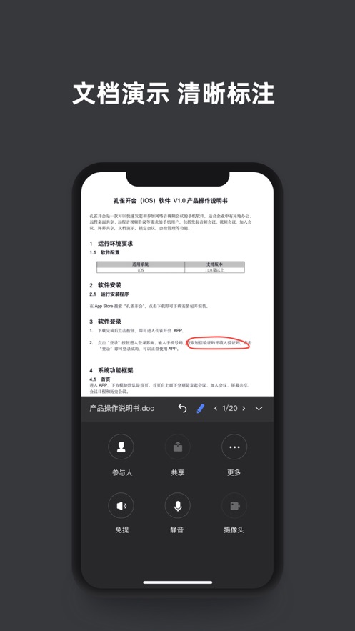 - 文档演示:随时将Word、PPT、等文件共享到会议中,并实时演示,同步翻页和标注