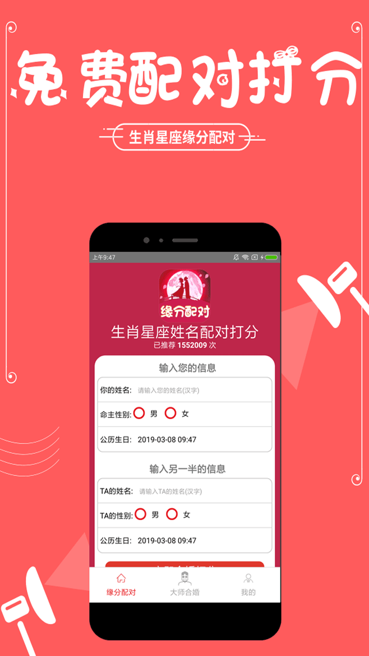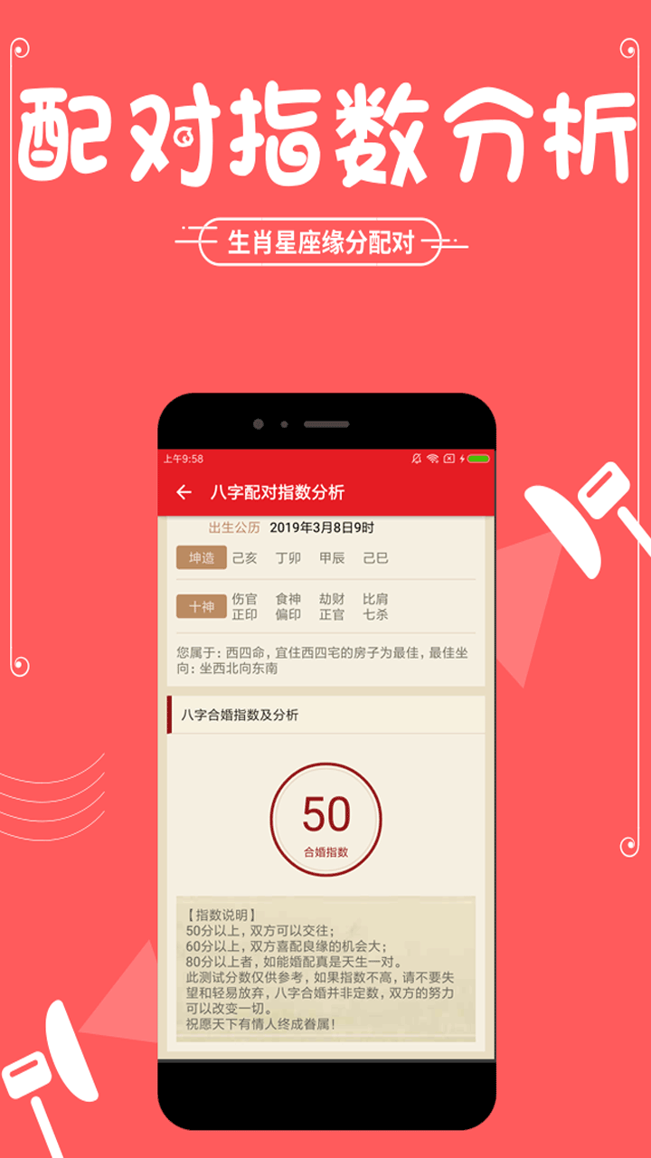 生肖星座姓名配对是一款利用生辰八字排盘、紫微斗数、四柱、梅花易数、易经卜卦、奇门排盘、奇门遁甲、手相面相 、塔罗牌星座占卜 等预测方法,从十二生肖、星座方面预测八字合婚方面、男女缘分配对指数、事业学业、财运运势,家庭健康,帮助你发现生活工作婚姻中的问题,预测未来命运,提高整体生活质量。