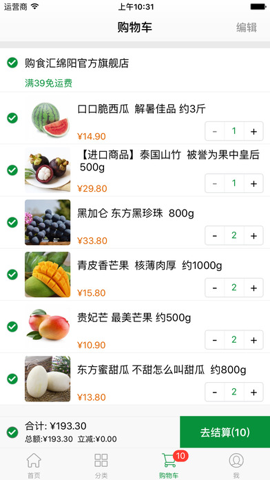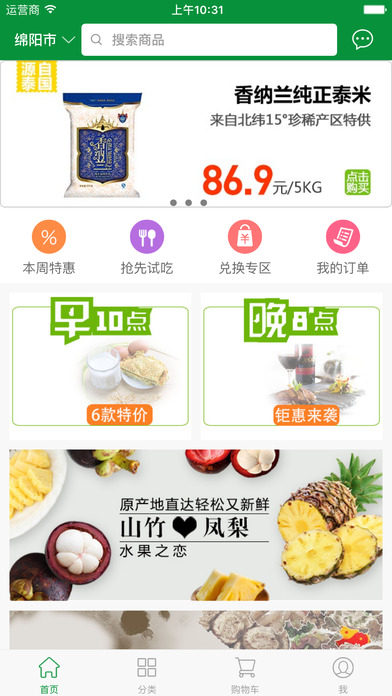 商品种类主要以生鲜为主,使用软件可在线浏览商品、完成订单支付,对商品进行评价等。
