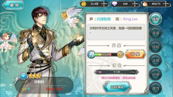 目前版本,这些骑士分为力量、智力和魅力三种类型。在“骑士”菜单中可以对已有的骑士进行养成,包括对骑士进行升星、、装备强化、技能升级,也可以查看骑士的属、好感度以及与其他骑士的连携关系。